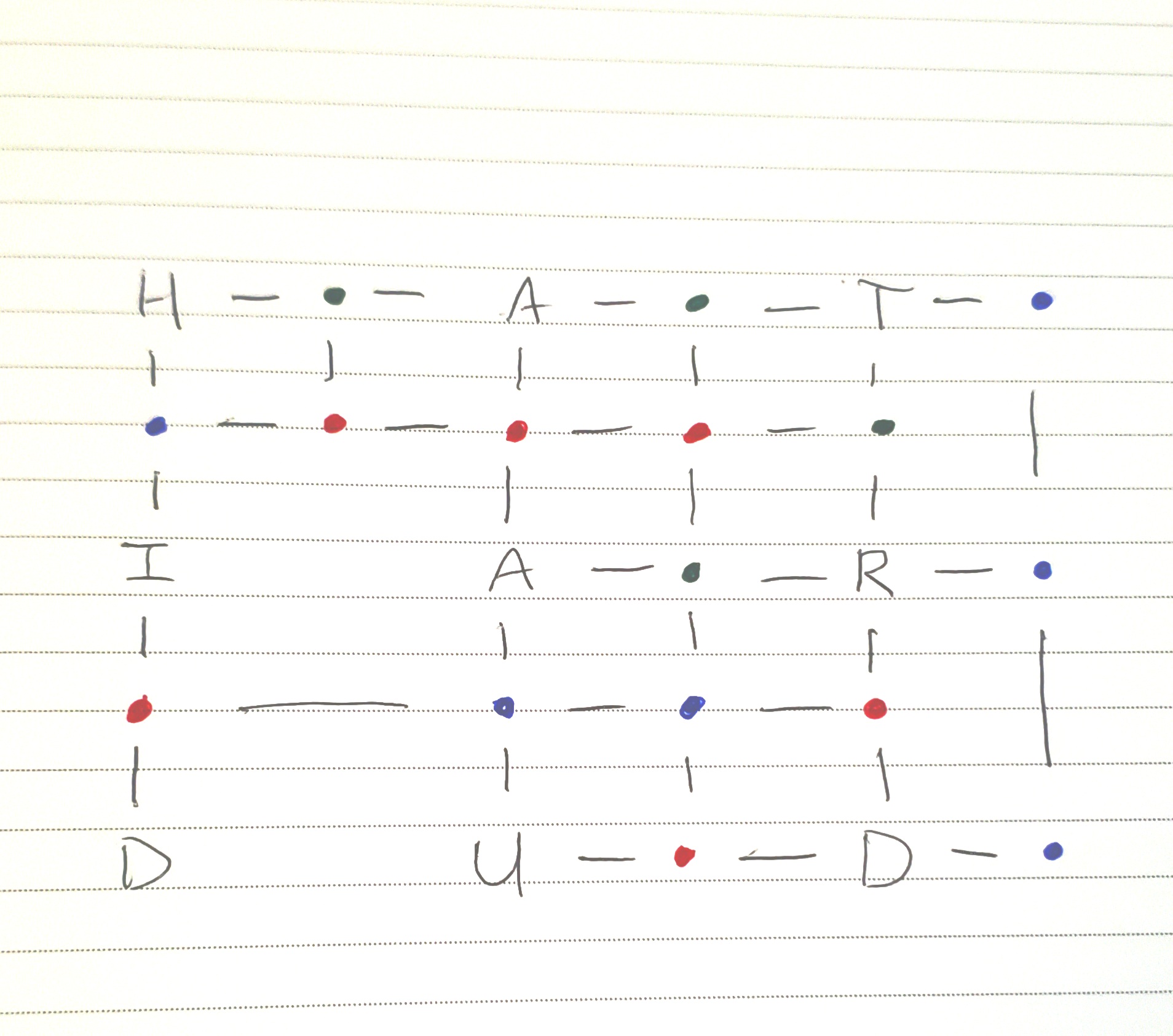 For a more concrete example, say I start at the top left H. If I go straight on red and straight on blue, I can go H-I-D. Hid. If I start at the bottom left D, go right on red, left on blue, and straight on green, I can go D-A-R-T, dart.